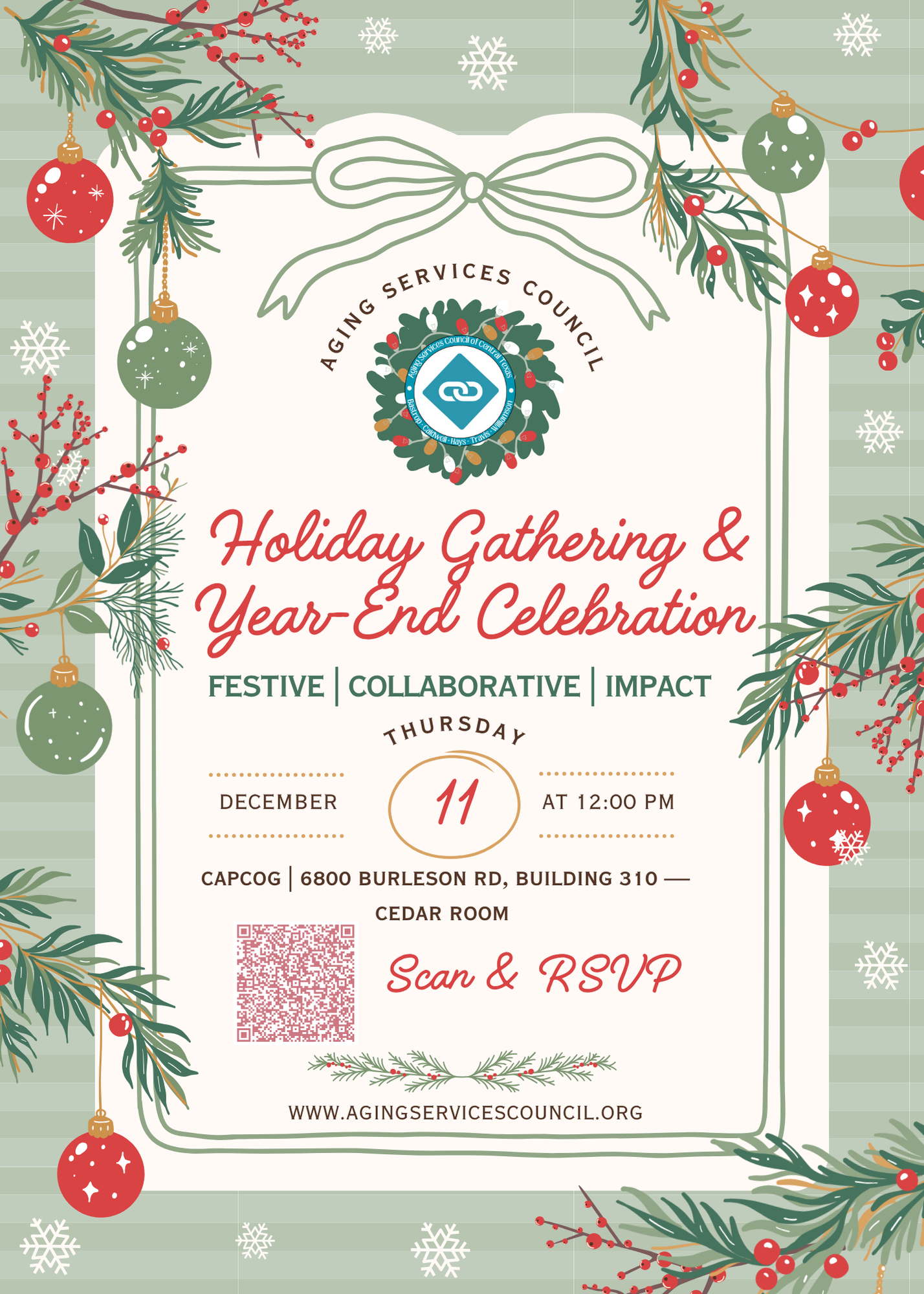 Location:In-person – CAPCOG | 6800 Burleson Rd, Building 310, Austin, TX 78744We’ll close out the year with a special in-person gathering celebrating the achievements and partnerships that make the Aging Services Council strong. The theme “Celebrating Collaboration” reflects our gratitude for the teamwork, innovation, and dedication that fuel our shared mission to serve older adults in Central Texas.