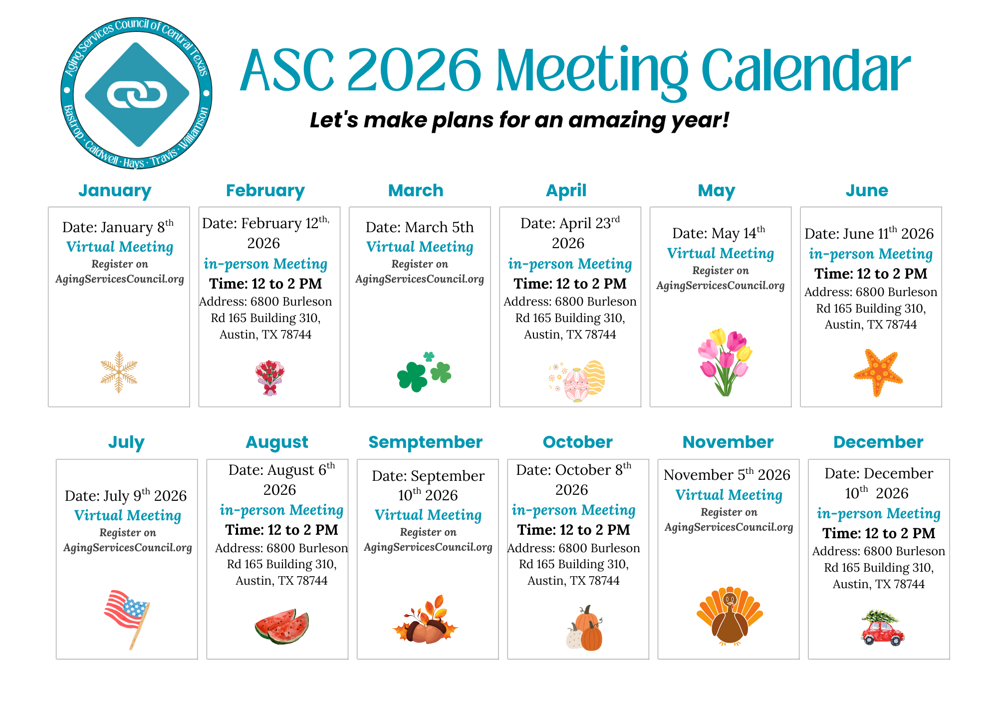 The Aging Services Council of Central Texas (ASC) is a collaborative network dedicated to empowering older adults and supporting caregivers across our community. We unite service providers, nonprofit organizations, government agencies, and passionate individuals to create a supportive, inclusive environment where aging is embraced, and the contributions of seniors are valued. Since our founding, ASC has focused on bridging service gaps, addressing systemic challenges, and fostering connections that enable older adults to live safe, healthy, and fulfilling lives.
